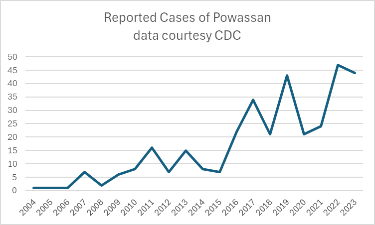 A recent headline caught my eye, discussing an increase in the annual reported cases of Powassan virus – a virus which (for reasons that will become obvious) is near and dear to me. I decided to take a look at the actual data in more detail, and discuss a bit of that here, because understanding viruses like Powassan has implications beyond just this one infection.